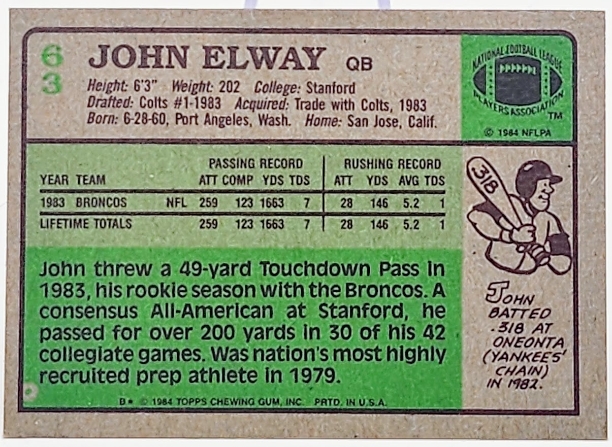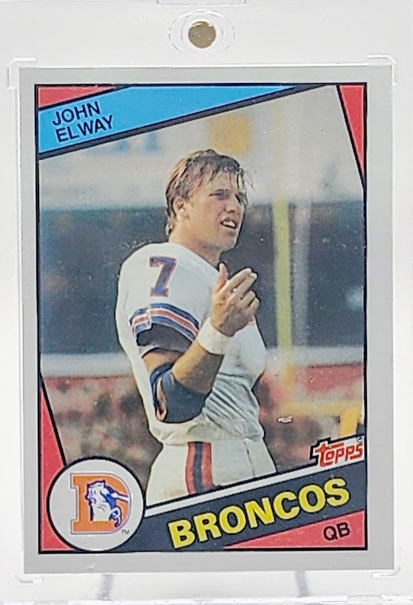 Collectors will appreciate this 1984 Topps Football #63 John Elway RC Rookie Card from the Denver Broncos. This original card has been carefully preserved in excellent condition, ensuring it will stand the test of time. Add this unique piece of sports history to your collection today.