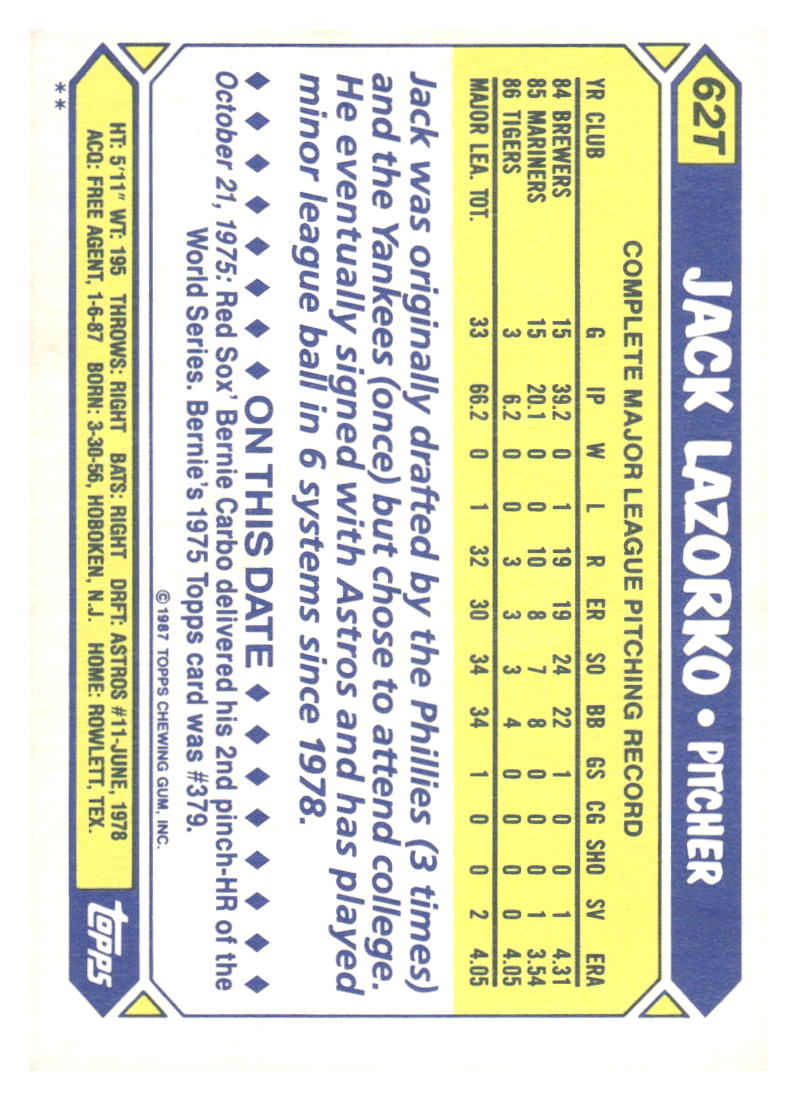 This is a nice example of a 1987 Topps Traded #62T Jack Lazorko