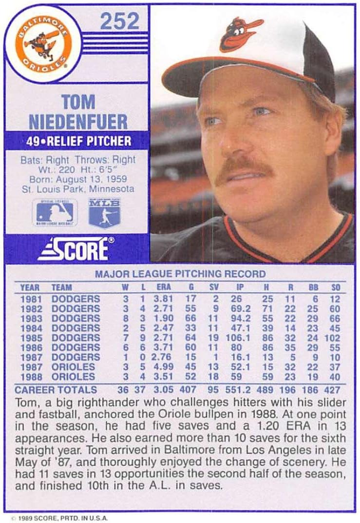 1989 Score Tom Niedenfuer #252 Baltimore Orioles