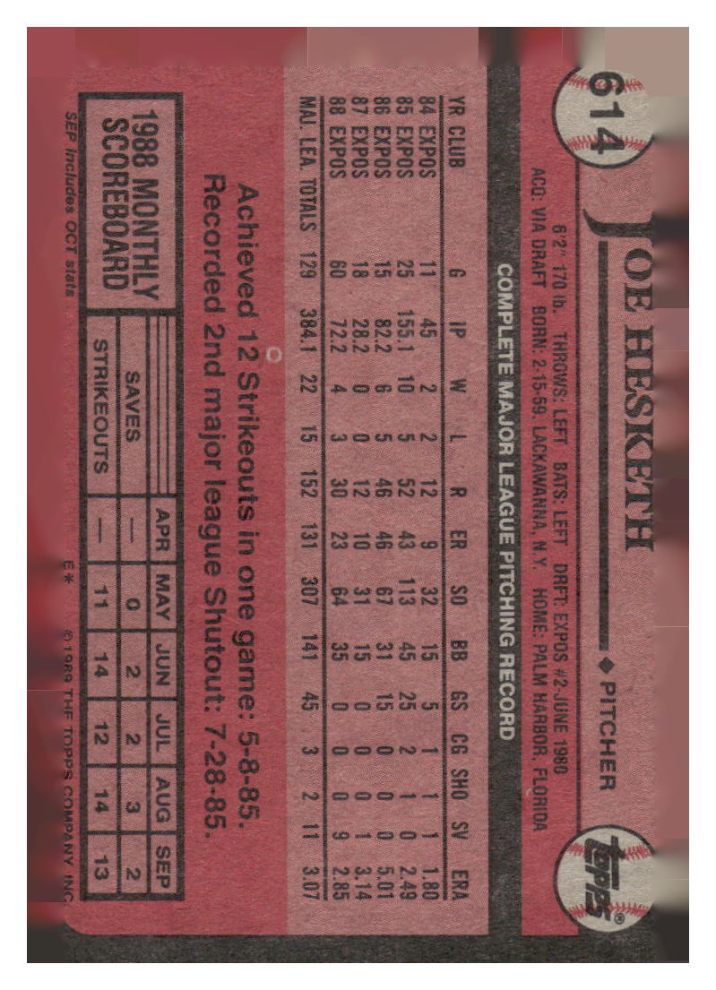 This is a nice example of a 1989 Topps #614 Joe Hesketh