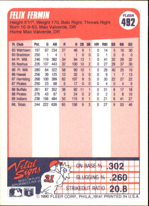 1990 Fleer Felix Fermin #492 Cleveland Indians
