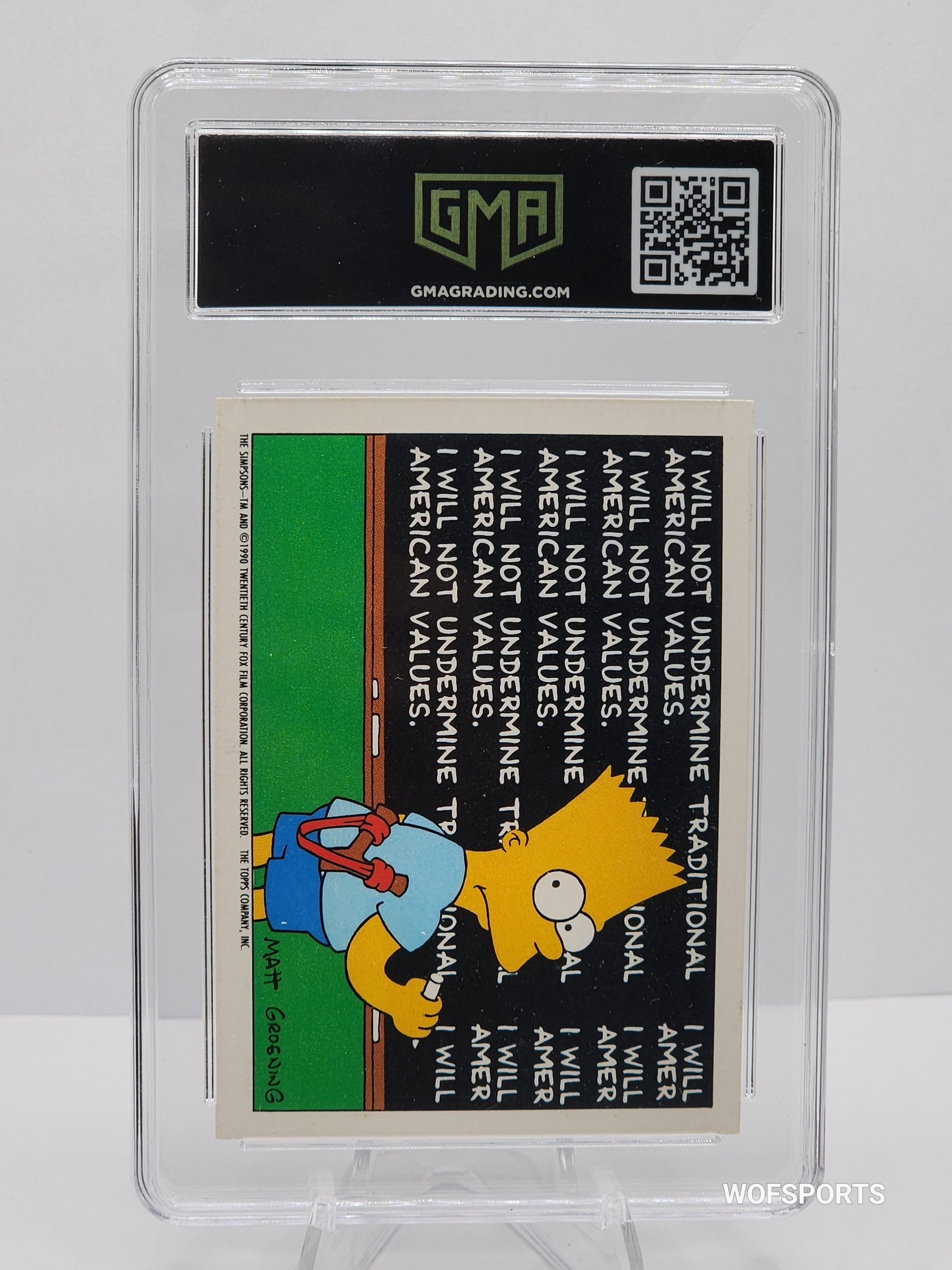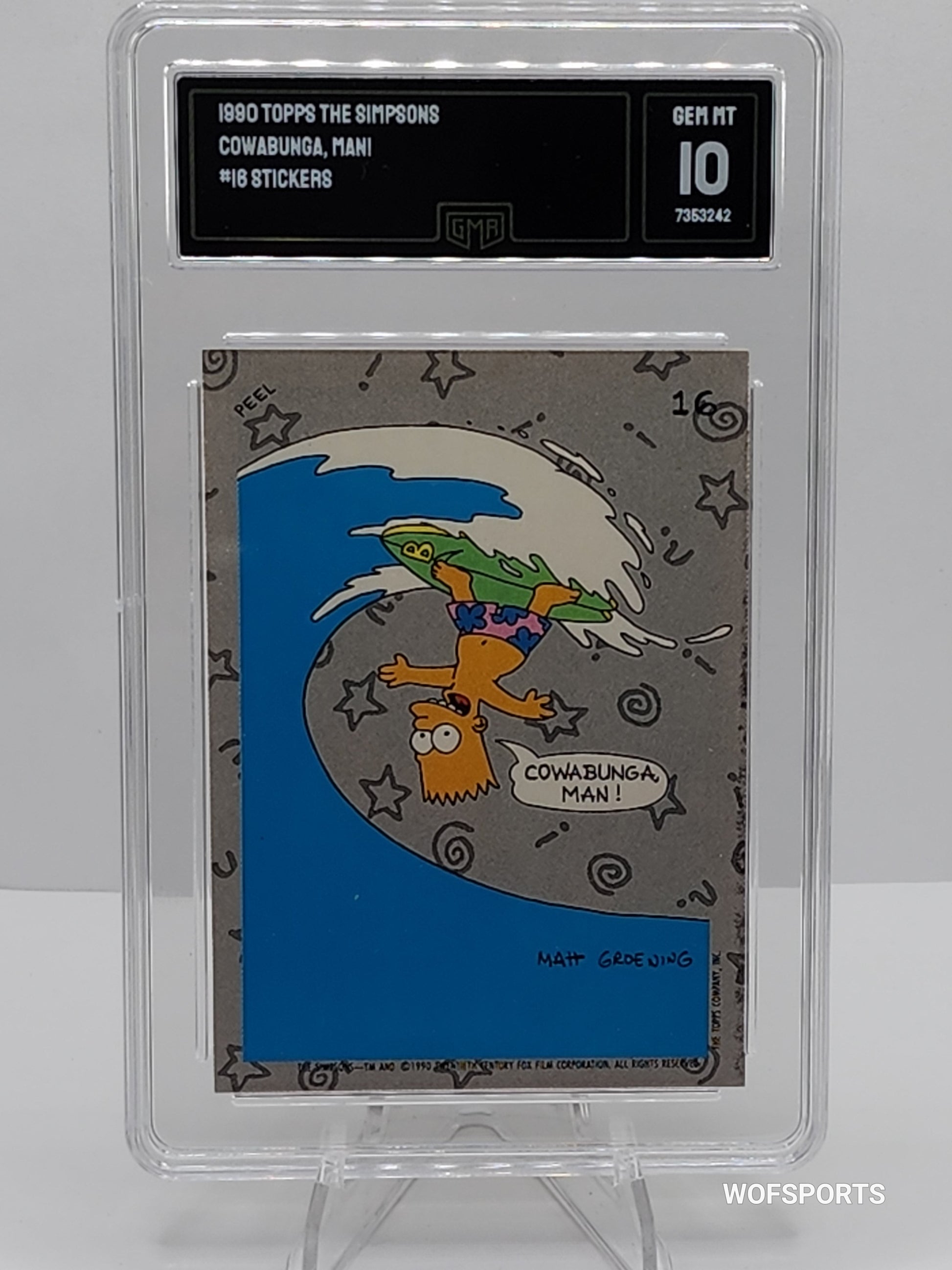 This 1990 Topps sticker features the iconic Simpsons cartoon characters with the phrase "Cowabunga Mani." Graded a perfect Gem MT 10 by GMA, this sticker is in pristine condition. Perfect for any fan or collector of The Simpsons!