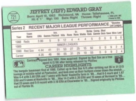 As an expert in the field, I present you with the 1991 Donruss Jeff Gray #721 Boston Red Sox. This collectible card features a 1991 Donruss design and showcases Jeff Gray, a former player for the Boston Red Sox. A must-have for any fan or collector, this card offers a piece of baseball history and nostalgia.