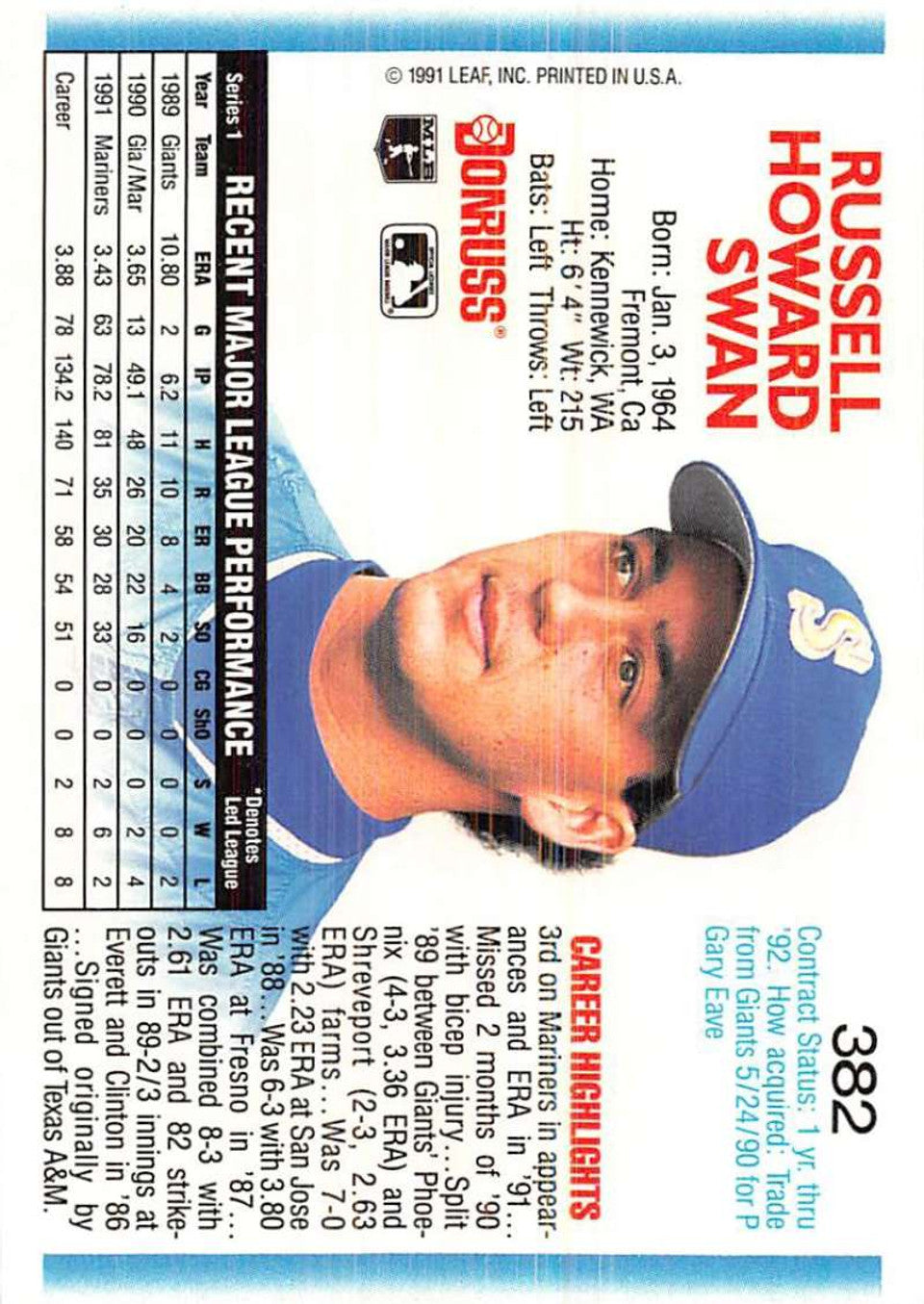 1991 Fleer Russell Swan #382 Mariners