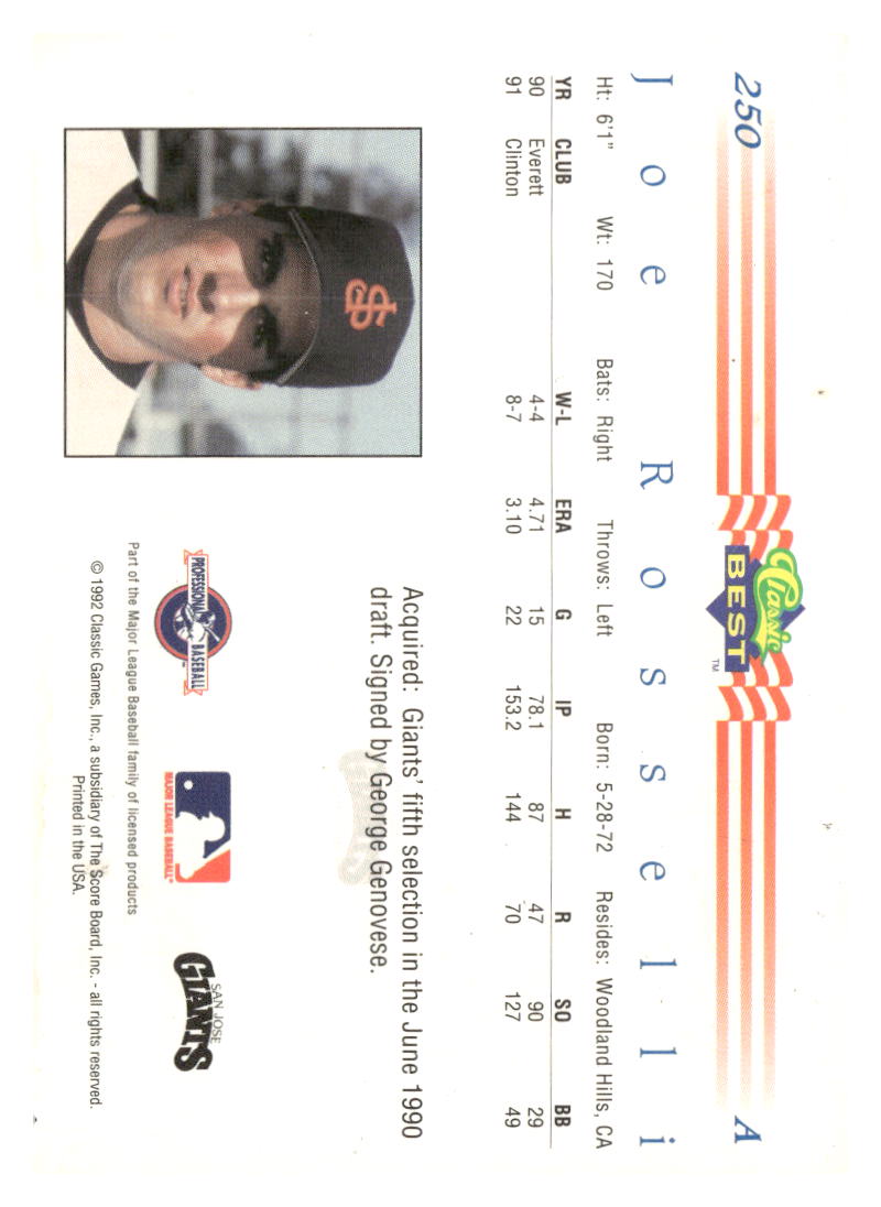 This is a nice example of a 1992 Classic Best #250 Joe Rosselli
