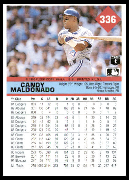 Get your hands on the 1992 Donruss Candy Maldonado #336 Toronto Blue Jays card, featuring the legendary outfielder himself. This highly sought-after card is a must-have for any Toronto Blue Jays fan, with its eye-catching design and top-notch quality. Add it to your collection today and showcase your love for the team.