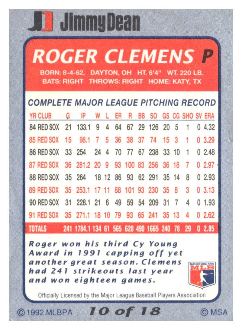 This is a nice example of a 1992 Jimmy Dean #10 Roger Clemens