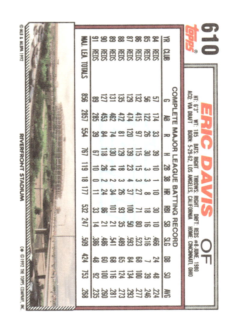 This is a nice example of a 1992 Topps #610 Eric Davis