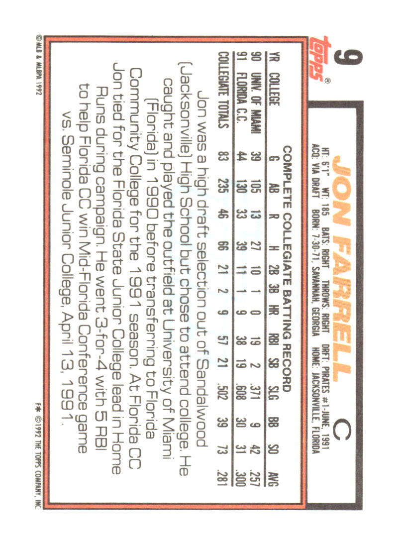 This is a nice example of a 1992 Topps #9 Jon Farrell