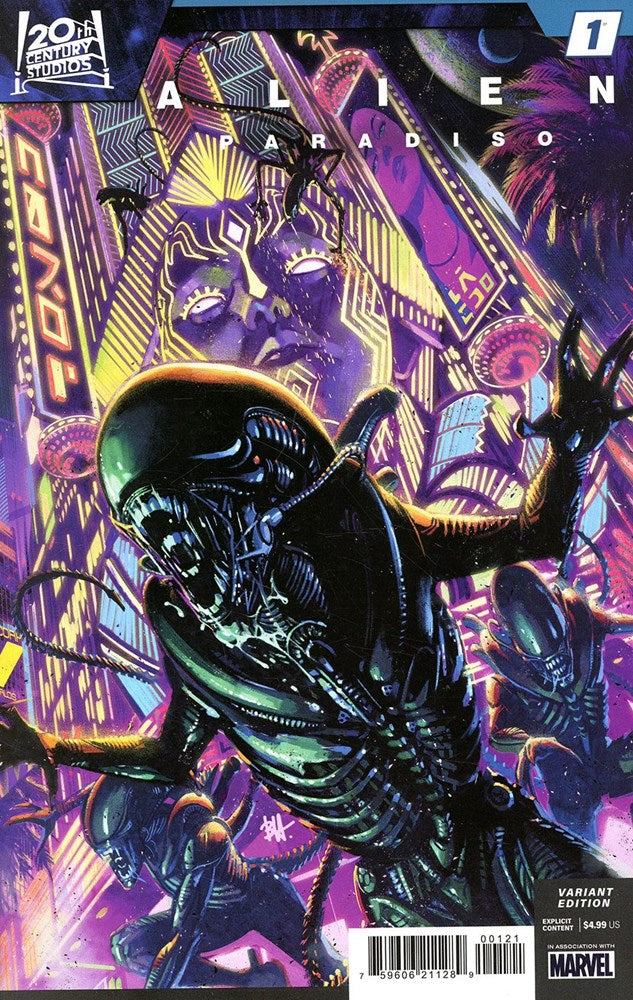 Welcome to Paradiso, where the money flows like blood and the blood flows like acid! The Tulum of space, Paradiso is a hidden gem among the colonies with its tropical climate, white sand beaches and a remarkable population of hyper-wealthy criminals. When Colonial Marshals Dash Nanda and Lydia Reeves are sent there to bust a smuggling ring, they think they've hit the job-assignment jackpot. But the only ones getting lucky here are those HUNGRY enough to take what they need. Steve Foxe, Edgar Salazar and guest contributor Peter Nguyen shine neon lights on the horrors of the Alien franchise with a bold story of the gambles we must take to survive!
