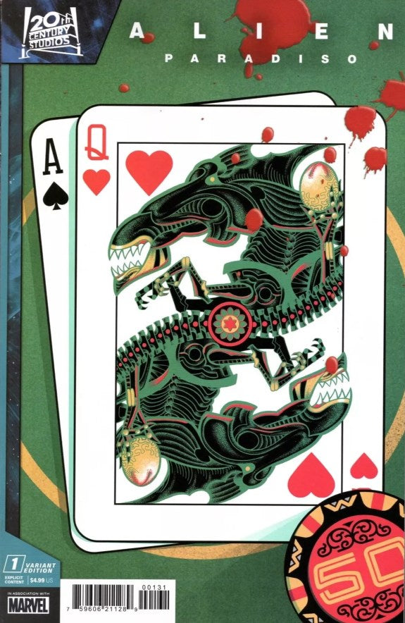 Welcome to Paradiso, where the money flows like blood and the blood flows like acid! The Tulum of space, Paradiso is a hidden gem among the colonies with its tropical climate, white sand beaches and a remarkable population of hyper-wealthy criminals. When Colonial Marshals Dash Nanda and Lydia Reeves are sent there to bust a smuggling ring, they think they've hit the job-assignment jackpot. But the only ones getting lucky here are those HUNGRY enough to take what they need. Steve Foxe, Edgar Salazar and guest contributor Peter Nguyen shine neon lights on the horrors of the Alien franchise with a bold story of the gambles we must take to survive!