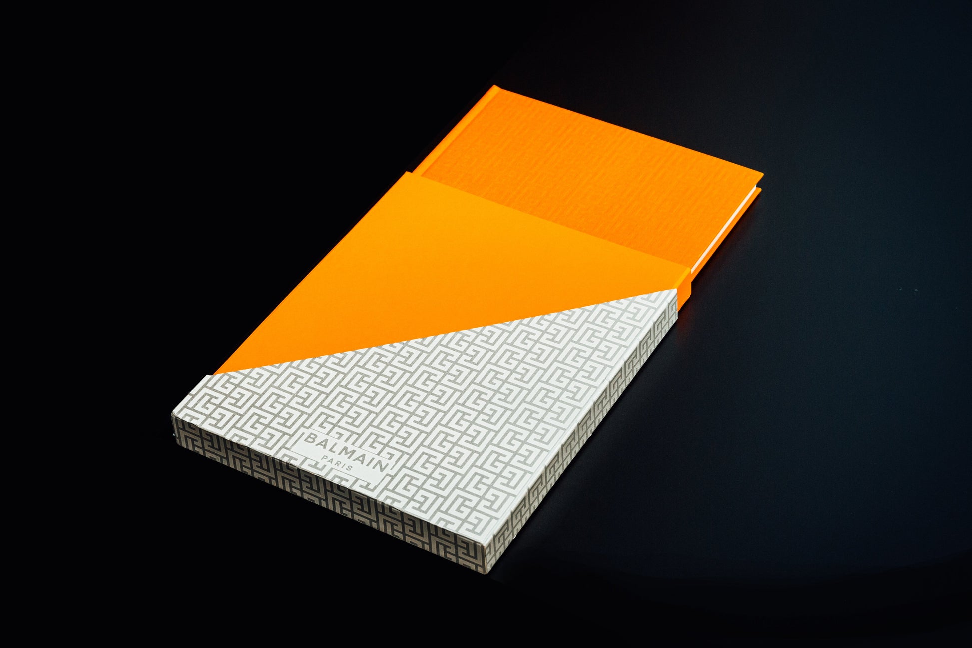 Orange fabric bound book embossed with Balmain's iconic monogram.