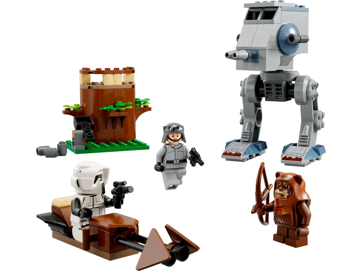 - Posable AT-ST walker, speeder and Ewok lookout – The AT-ST has a cockpit for the AT-ST Driver, and the Ewok hideoutfeatures a tree and a catapult for Wicket to launch stone elements