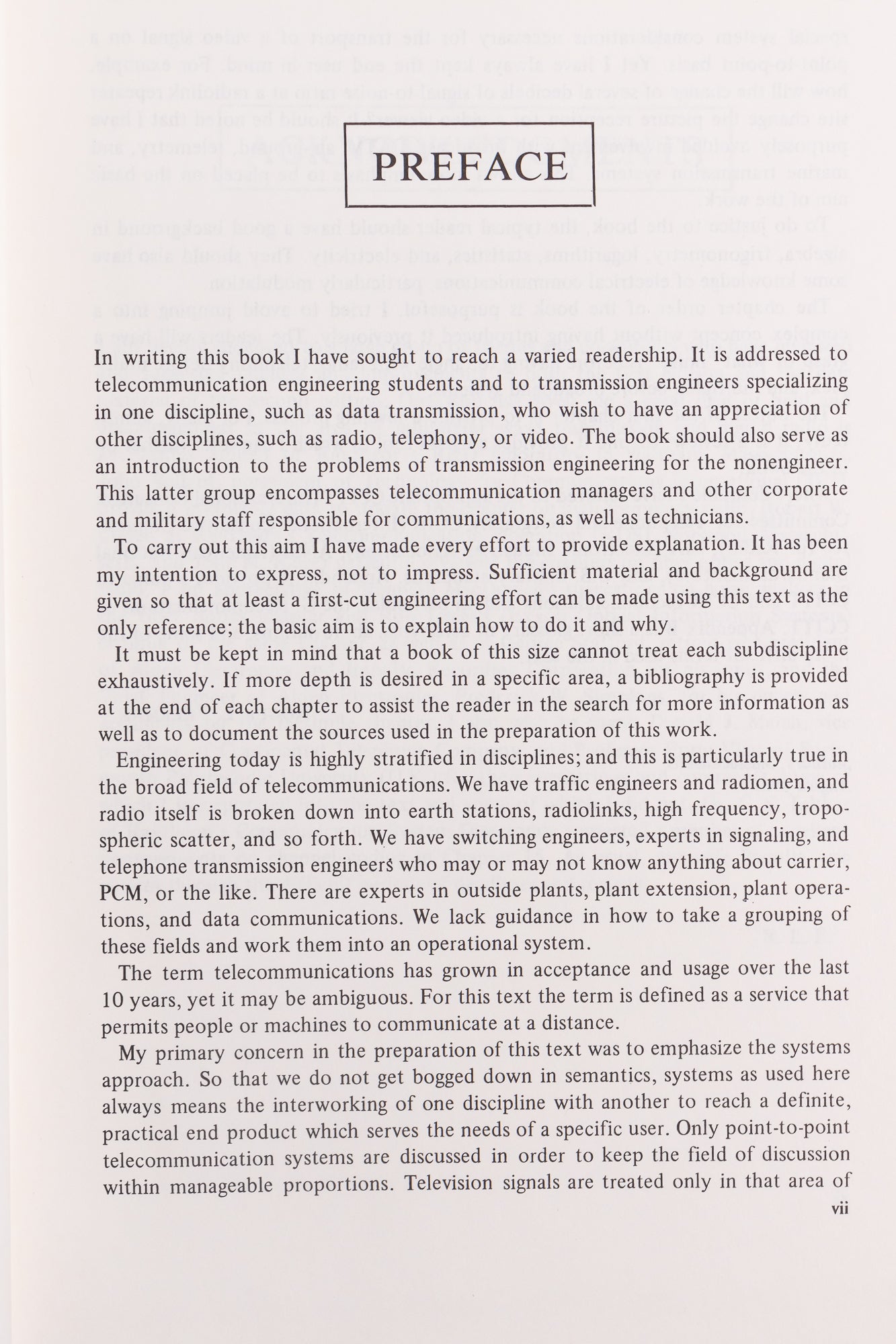 "In writing this book I have sought to reach a varied readership. It is addressed to telecommunication engineering students, and to transmission engineers specializing in one discipline, such as data transmission, who wish to have an appreciation of other disciplines, such as radio, telephony, or video. The book should also serve as an introduction to the problems of transmission engineering for the non-engineer. "